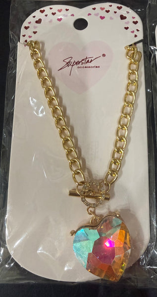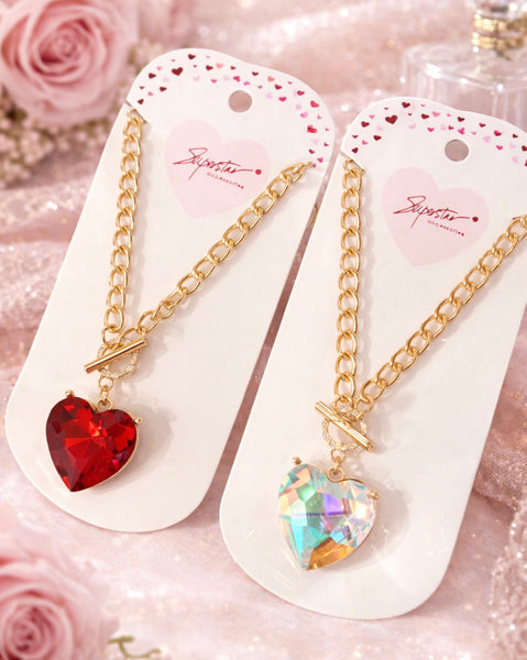 Available in classic ruby red or iridescent crystal, each heart catches the light beautifully, reflecting depth, color, and shine with every movement. The toggle-style clasp adds a modern touch while keeping the look elegant and easy to style.