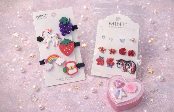 Each pack includes a mix of unicorn-themed accessories such as hair clips, bows, earrings, charms, pouches, and fun extras—perfect for dress-up, everyday wear, sleepovers, or gifting. Featuring pastel hues, holographic finishes, and adorable unicorn designs, this collection brings instant joy and imagination to any outfit.